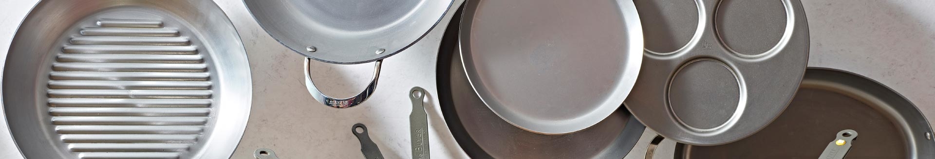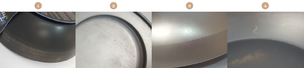 鐵鍋上的白色痕跡不是製造缺陷 (詳圖4) 。 de Buyer鐵鍋由高噸數沖壓和拉絲的粗鐵一體連續製成。由於鐵本身具有延展性,經過機具壓軋成形的過程,在鐵鍋表面自然生成痕跡,但為了保有絕對天然特性,de Buyer不做其他化學美化的加工,這些僅為視覺上的痕跡並非刮痕,表面是平滑的,完全不影響鐵鍋的烹飪效果!這些痕跡會隨著經常的使用並在充分養鍋後慢慢消失。
