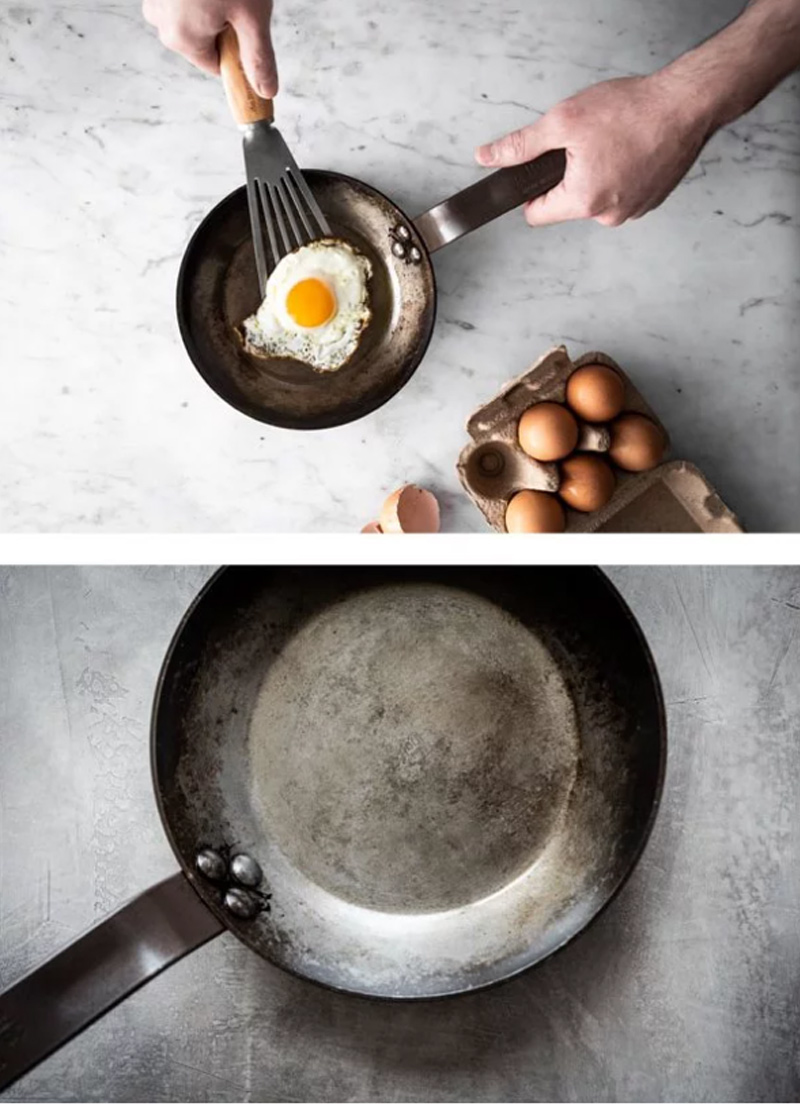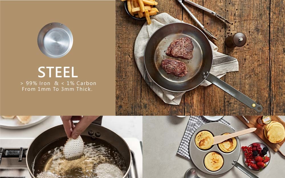 These timeless pans are ideal for High-temperature cooking. By reaching quickly and sustaining high temperature, Iron Frypans are simply the best and first choice of a Chef to sear and grill steaks, caramelize meat juices, onions and vegetables, brown potatoes, or perfectly fry fish. Steel pans are not a Chef choice to stew or slow cooking dishes.