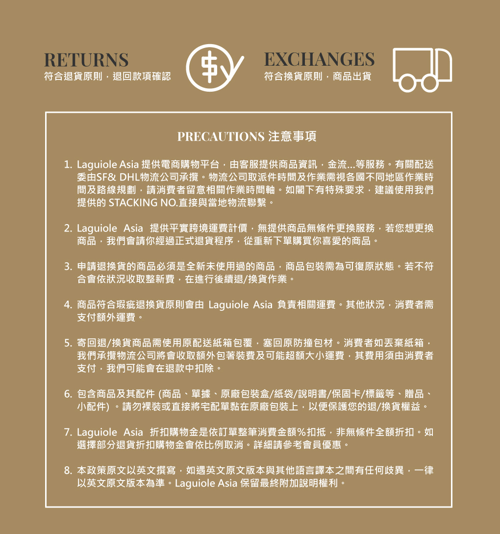 In order to provide you with the best possible online shopping experience, Laguiole Asia maintains a 7-days return policy from the date you received your order (based on the courier delivery receipt date). Please note our policy has restrictions and conditions described in full transparency in this page. In case of doubts don't hesitate to contact us.