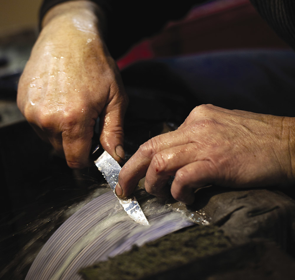 Shape and then polish its handle (wood, horn, Composite material, the possibilities are endless) using sisal and cotton disks that enable the bolsters and handle to be perfectly adjusted. Once the handle has been perfectly formed, it has to be buffed to give it its smooth, shiny appearance.