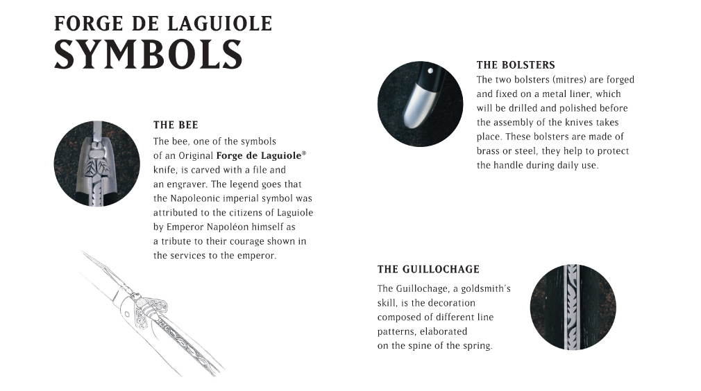 The bee became the standard decoration from 1909 onwards. Forge de Laguiole continues to honor this tradition and makes models with traditional bees as well as customized springs. Each bee, and each spring, is hand-sculpted in the traditional manner.