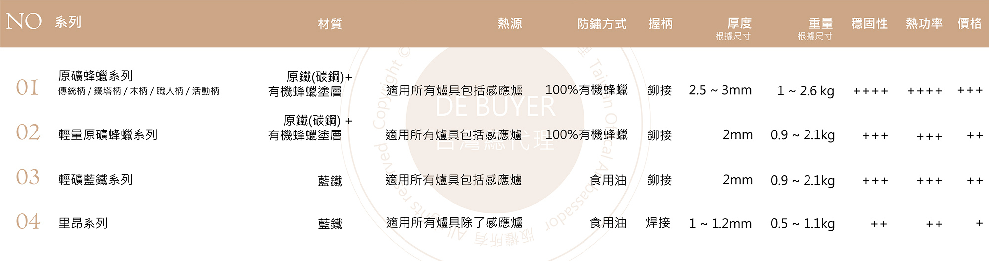 de Buyer 的每個鐵鍋原鐵程度高達99%以上,因無塗層,故無法完全隔絕,因空氣中的濕氣而產生的鏽漬。de Buyer 在出廠前,依據系列的不同,以專利技術噴上100%有機蜂蠟,或是採用無汙染方式防鏽,在鐵鍋運送過程或是在倉庫保存時,若遇到溫差,易造成蜂蠟軟化摩擦,或是防鏽食用油被外包裝紙袋吸附,出現新鍋局部鏽漬。