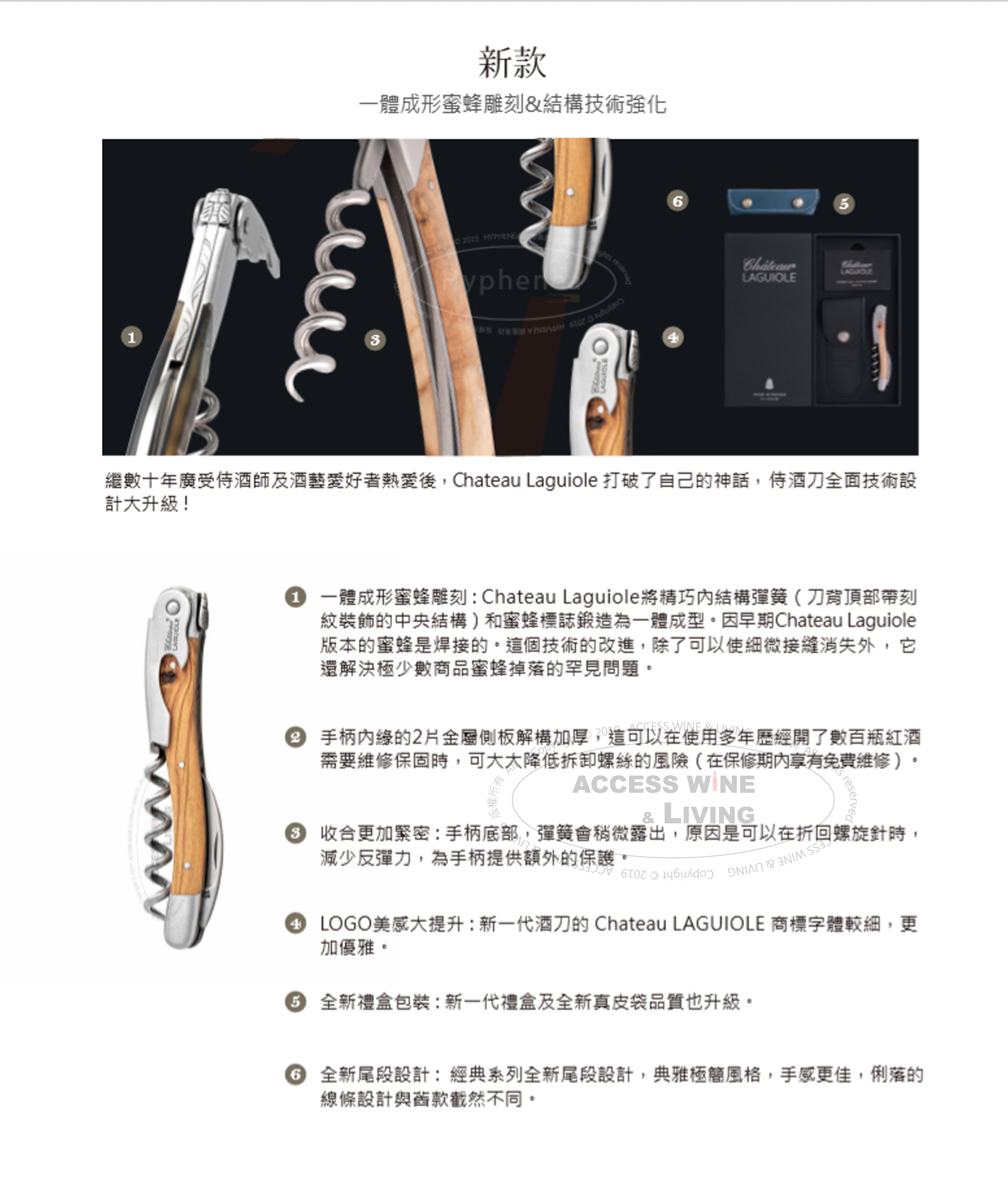 位在阿維隆省的拉吉爾或蒂耶爾(Thiers),不僅是Chateau Laguiole的產地,也是幾世紀以來歐洲手工刀具的重鎮。Chateau Laguiole侍酒刀大受歡迎之後,在這同等級的的刀匠也開始製作出極富質感與特色的侍酒刀,在當地刀具產業興起了一股良性競爭。然而,卻有些不肖業者在全球各地,以拙劣的技術仿造Chateau Laguiole侍酒刀,侵犯Chateau Laguiole的專利、商標和版權。千萬別被價格低廉的仿冒品給蒙騙,敬請安心在ACCESS WINE & LIVING選購Chateau Laguiole正版侍酒刀,其母公司頤爾東西國際有限公司為Chateau Laguiole在大中華地區官方指定代理商,並提供侍酒刀原廠終身保固服務。