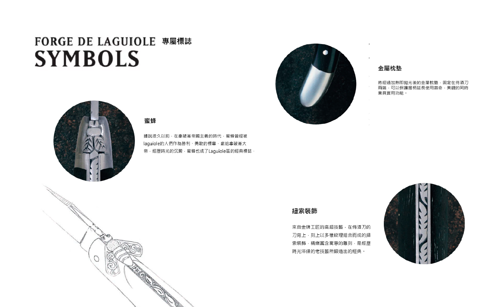 蜜蜂從1909年開始成為Laguiole地區刀具的標準傳統標記。Forge de Laguiole 當然秉承這一傳統,並將傳統蜜蜂標誌客製化打造每一把刀具中最主要的骨幹。而每隻蜜蜂和每把骨幹都用最傳統手工劃製雕刻。
