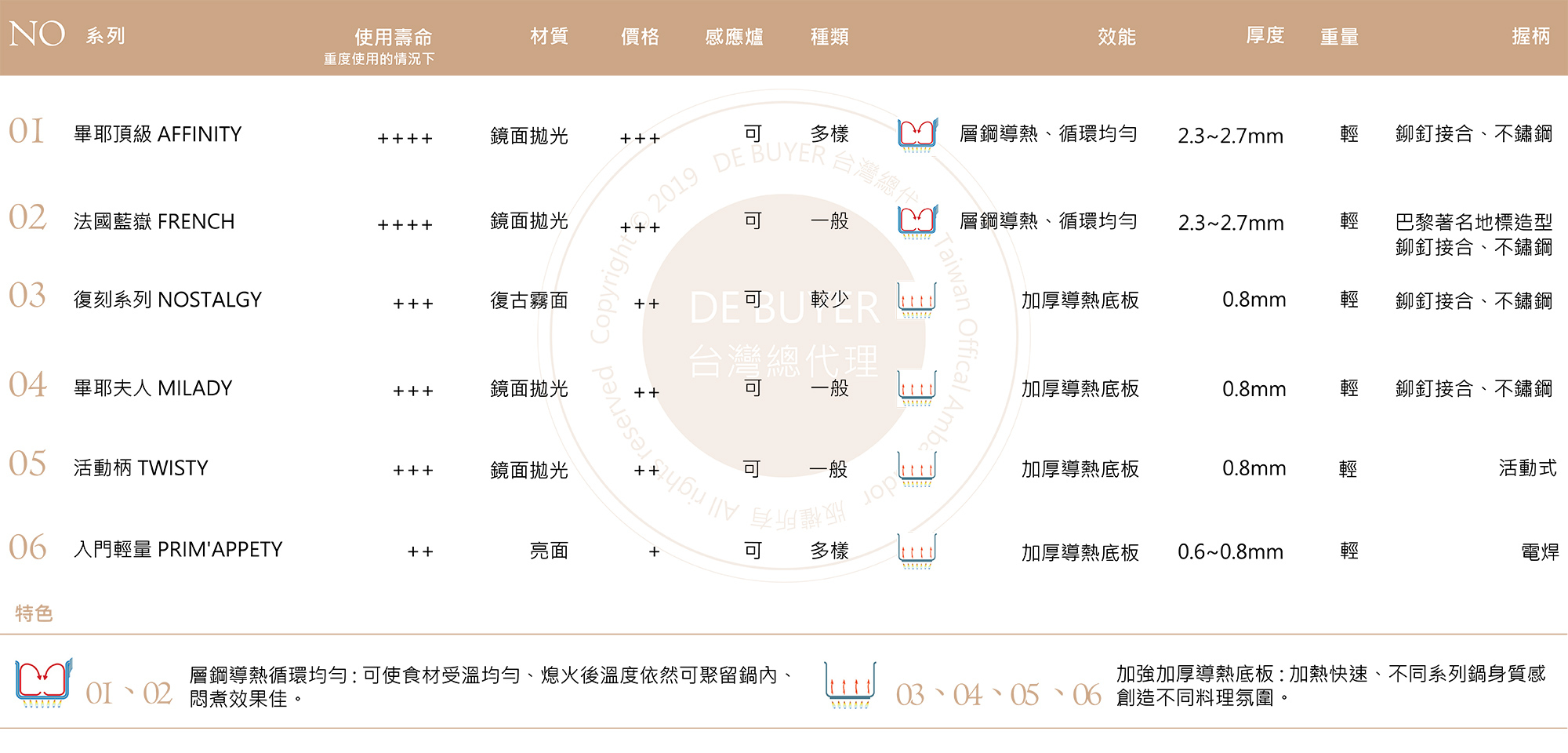 Prim' Appety 系列, de Buyer專為主廚及料理達人打造的耐用cp款,耐得住天天使用的專業級鍋具。由18/10頂級工藝鏡面不鏽鋼製成,適用所有爐具包括感應爐,鍋身輕巧配備加厚導熱底板,加熱迅速,蓄熱效果好,價格親民經濟實惠,小資、外宿首選系列鍋款。符合人體工學的中空加長的握柄,可離火源遠多降低受熱,多點焊接鍋身,舒適好抓握,吊掛孔設計便於收納。Prim' appety 系列是畢耶最暢銷的系列鍋款之一。不銹鋼輕巧鍋體加熱迅速,可另搭配選購半圓提把造型鍋蓋,不同鍋型之間都可以靈活調動共用。