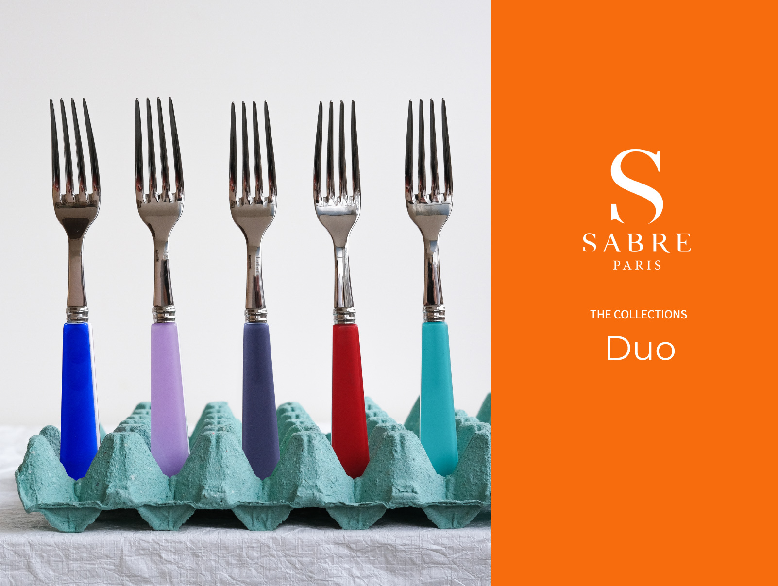 告別沈悶的餐桌,迎接多彩的盛宴!DUO 系列源自於 Sabre Paris 掌握的巧妙手工工藝,透過雙層雙色手柄俐落線貼為餐具帶來活力。這個明亮的系列有多色調可供選擇,日常用餐可以更加俏皮。